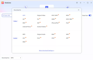 Open OneConv and navigate to the “Download” panel. Here, you’ll find an option to select the output format. Choose MP4, as this is a widely supported format that works on most devices.